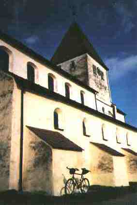 ...in front of St. Georg, Oberzell, a romanesque church on the Isle of Reichenau, Bodensee, Germany (1997).