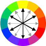 Aus den Grundfarben (siehe Colour Part 1/Basics) ergeben sich die Komplementaerfarbenpaare: Gelb - Violett, Rot - Gruen, Blau - Orange. Im Farbkreis Ittens entsprechen diese den jeweils gegenueberliegenden Farben im aeusseren Ring. Die Komplementaerfarbe zu einer Grundfarbe ist die Mischfarbe der beiden anderen Grundfarben. Dies trifft natuerlich nicht nur auf die Grundfarben zu, auch jeder Zwischenton hat sein Komplement. So ist zum Beispiel die Komplementaerfarbe von Rotorange - Blaugruen. |